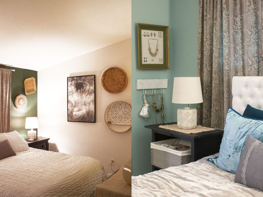Be sure to test your paint colors in your small space at all times of day before committing to a color. My first attempt at painting our bedroom, above, I used white paint because I thought it would make the room bigger, but in the dark it actually made my walls look boring and grey. A pale green color called Copper Patina ended up being a better selection for a small dark room. It created a comfy vibe, and I get compliments on this color all the time!