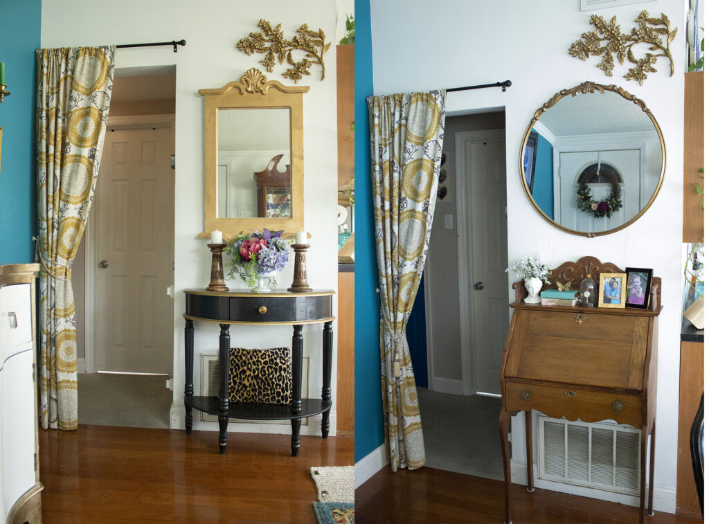 With a small space, you can’t afford to decorate with furniture that is pretty but has no storage. An example is the black console table I used to have in my living room, shown above on the left. The small drawer didn’t hold much. The secretary desk I use now, above right, is home to my keys, laptop, and stationery.